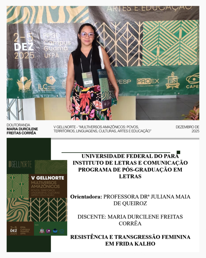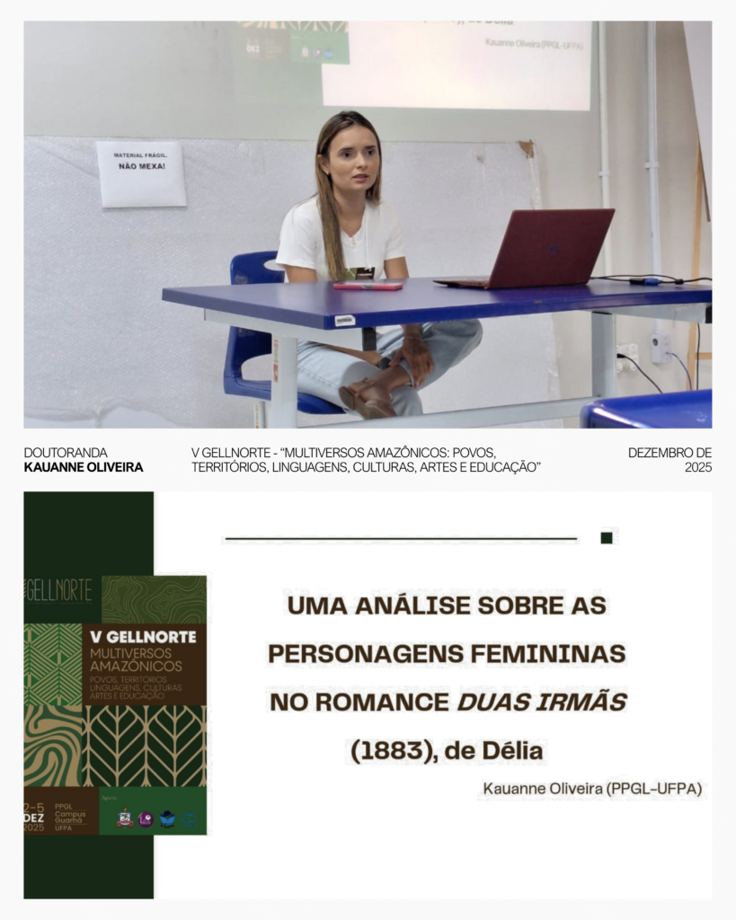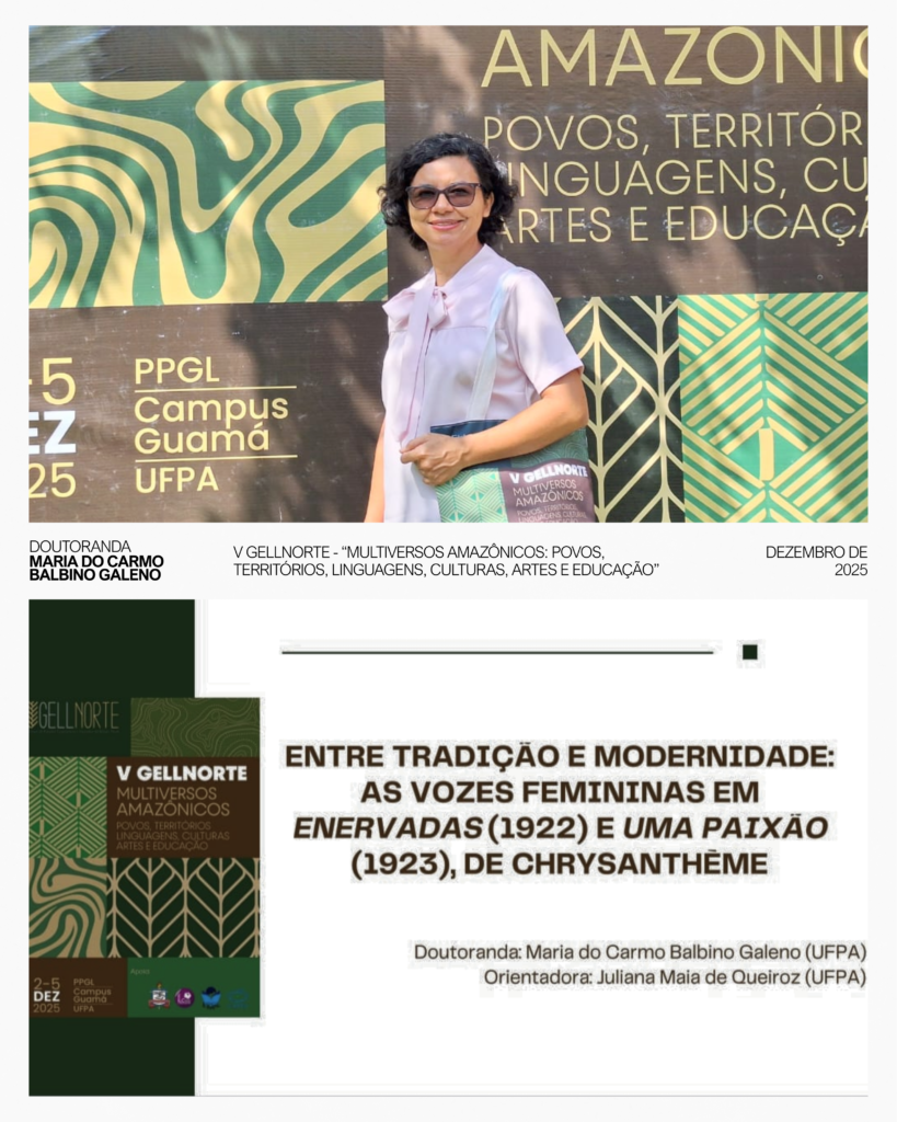 O Grupo de Estudos Vozes de Mulheres na Literatura (GEMLIT) marcou presença no V Encontro Nacional da Associação GELLNORTE – Grupo de Estudos Linguísticos e Literários da Região Norte, realizado de 2 a 5 de dezembro de 2025, na Universidade Federal do Pará (UFPA), Campus Guamá, no âmbito do Programa de Pós-Graduação em Letras (PPGL).