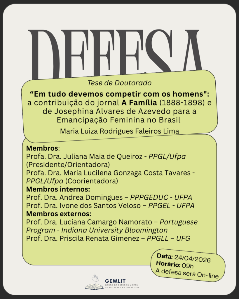 A banca examinadora será composta pela Profa. Dra. Juliana Maia de Queiroz (PPGL/UFPA), na condição de presidente e orientadora, e pela Profa. Dra. Maria Lucilena Gonzaga Costa Tavares (PPGL/UFPA), como coorientadora. Como membros internos, participam a Profa. Dra. Andrea Domingues (PPPGEDUC/UFPA) e a Profa. Dra. Ivone dos Santos Veloso (PPGEL/UFPA). Já como membros externos, integram a banca a Profa. Dra. Luciana Camargo Namorato (Portuguese Program – Indiana University Bloomington) e a Profa. Dra. Priscila Renata Gimenez (PPGLL – UFG).